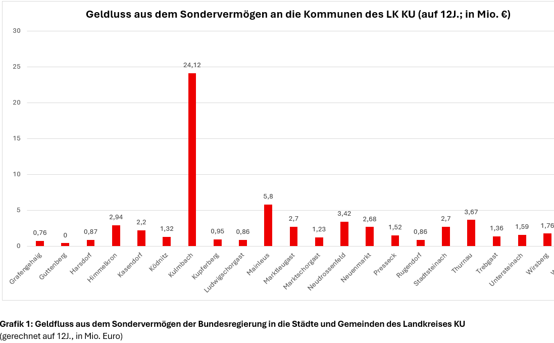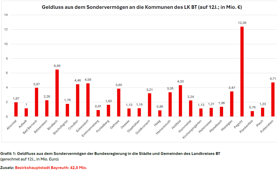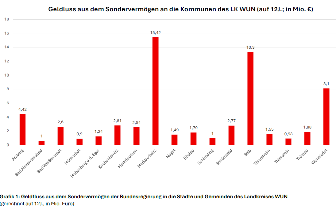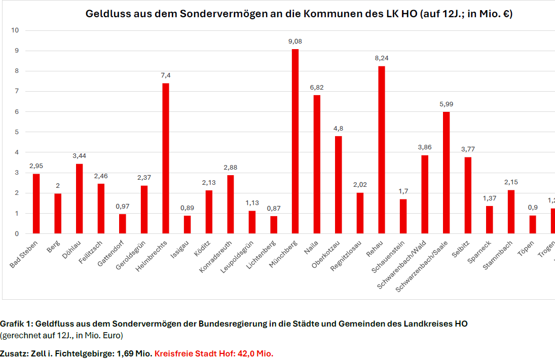 Der Landkreis Wunsiedel selbst erhält fast 16,5 Millionen Euro, der Landkreis Kulmbach gut 15 Millionen, Bayreuth und Hof beinahe 23 Millionen Euro.. Auf die Gemeinden in ganz Oberfranken entfallen Gelder in Höhe von beinahe 337 Millionen Euro, auf die Landkreise insgesamt fast 176 Millionen Euro.
