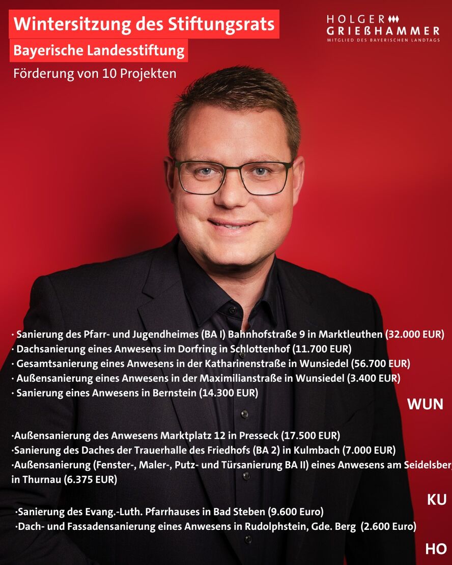 „Die Förderung des Stiftungsrates für soziale und kulturelle Projekte ist eine schöne Möglichkeit, unsere Einrichtungen und Baudenkmäler zu sanieren. Deshalb freue ich mich ganz besonders, dass ich mich für Oberfranken einsetzen und diese Maßnahmen unterstützen konnte. Ich werbe gerne dafür, weitere Anträge aus den Landkreisen an die Stiftung zu stellen“, unterstreicht Holger Grießhammer.