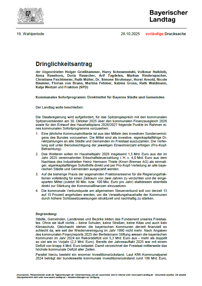 Kommunales Sofortprogramm: Direktmittel für Bayerns Städte und Gemeinden