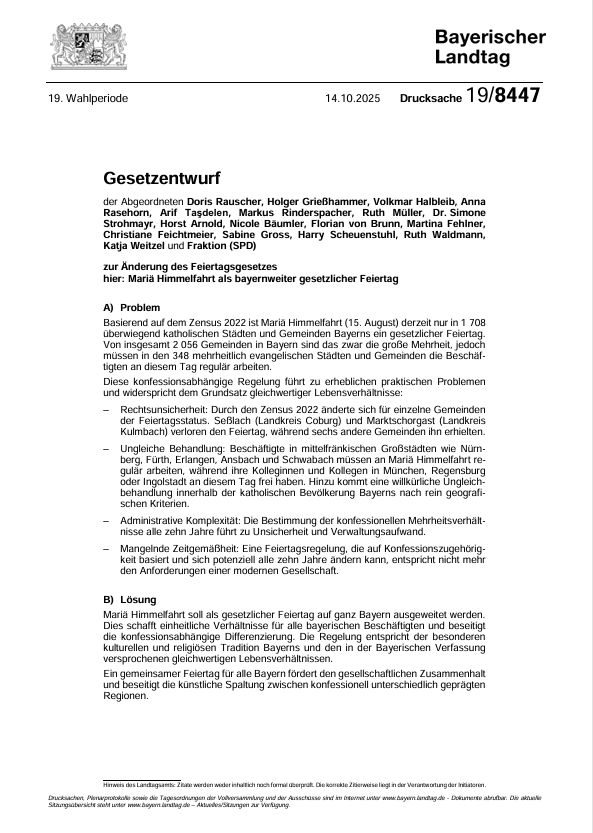 Mariä Himmelfahrt als bayernweiter gesetzlicher Feiertag