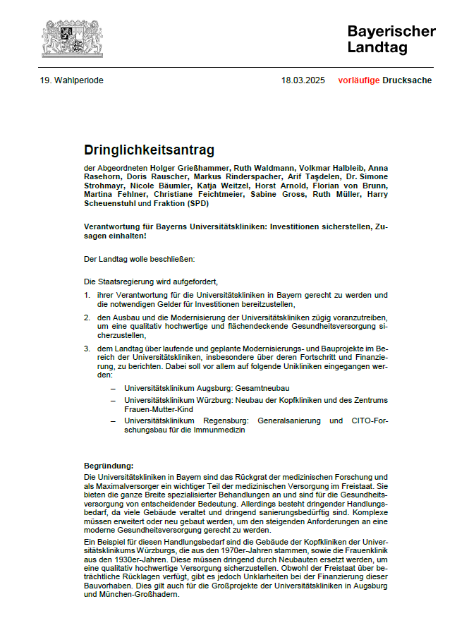 Verantwortung für Bayerns Universitätskliniken: Investitionen sicherstellen, Zusagen einhalten!